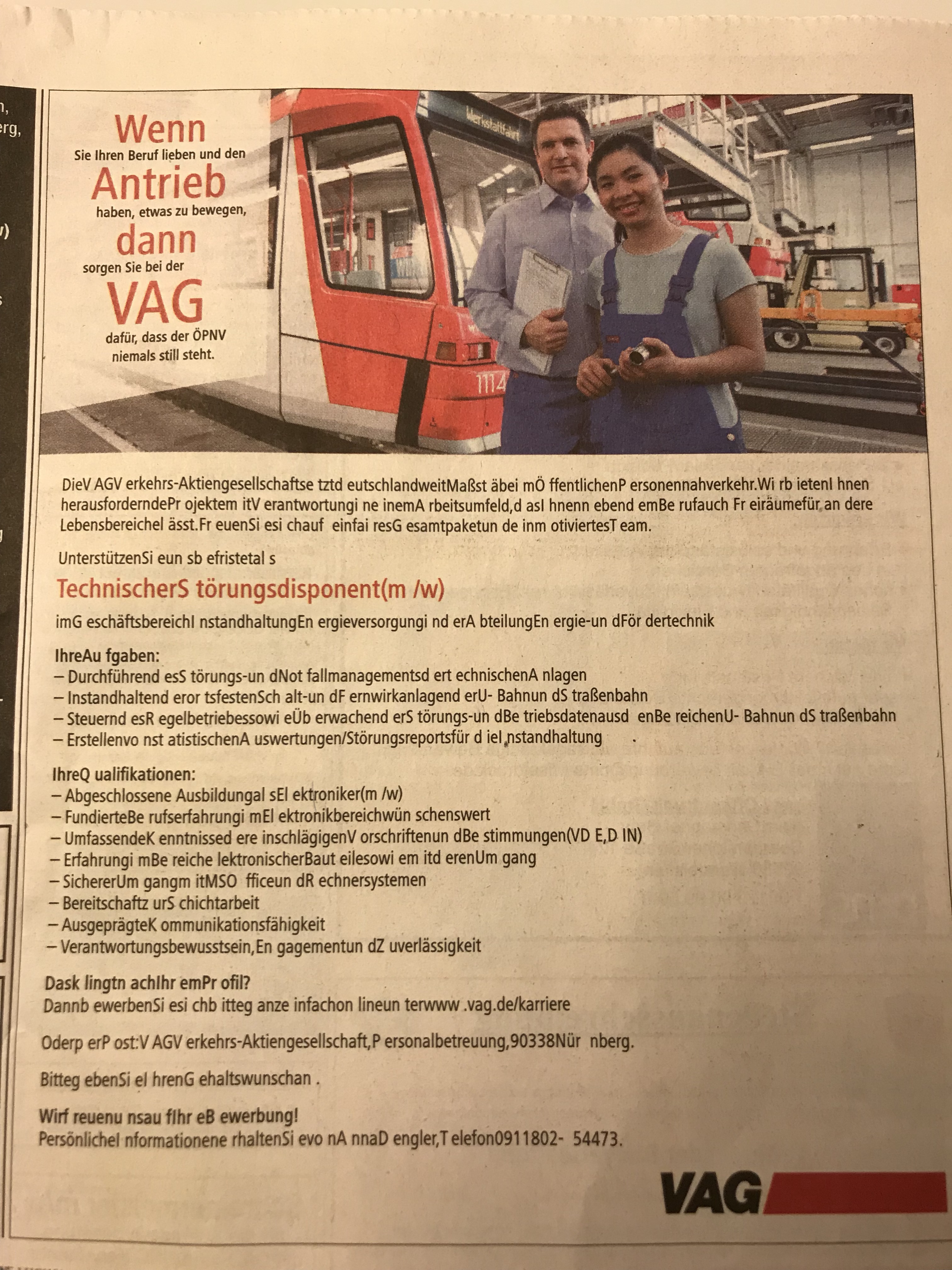 Heute, die Stellenanzeige der örtlichen Verkehrsbetriebe im Anzeigenteil: