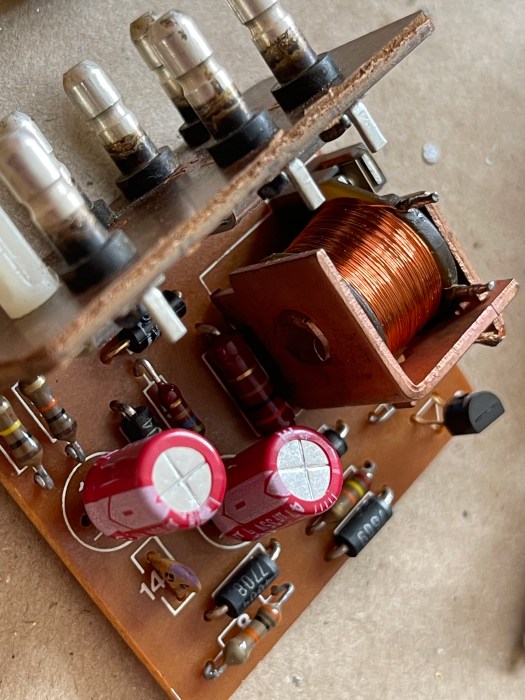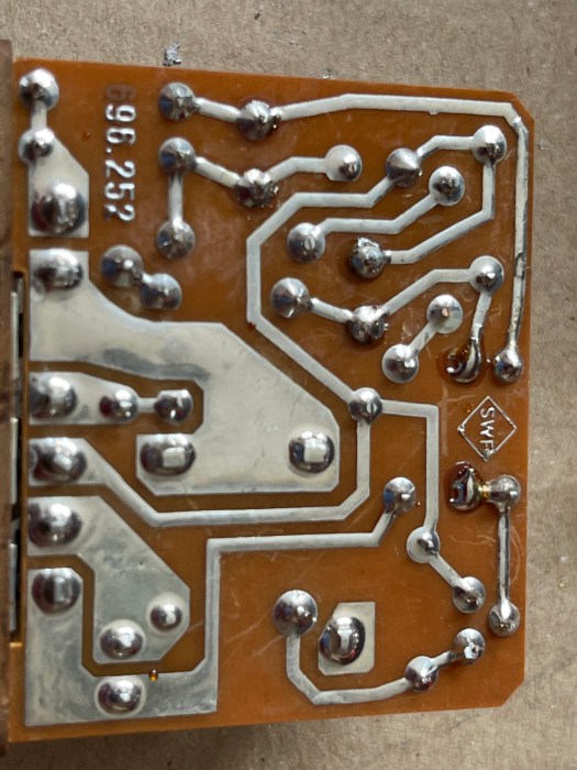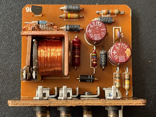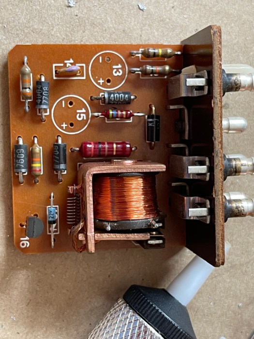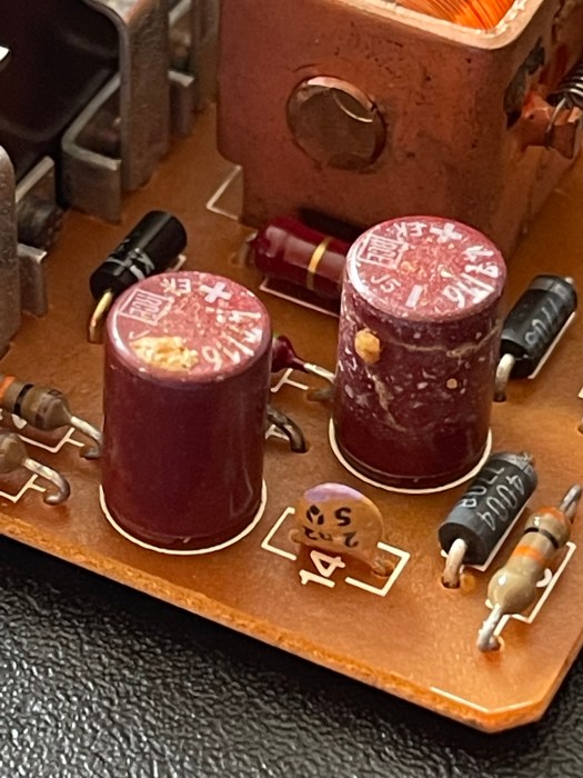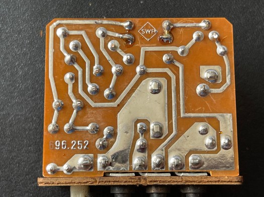Sofort wird sichtbar, dass hier – wie so oft – zwei Elektrolytkondensatoren ihre Altersgrenze überschritten haben … es ist Flüssigkeit ausgetreten, die sind wohl hin. Die restlichen Bauelemente sehen auch nach 44 Jahren noch gut aus.