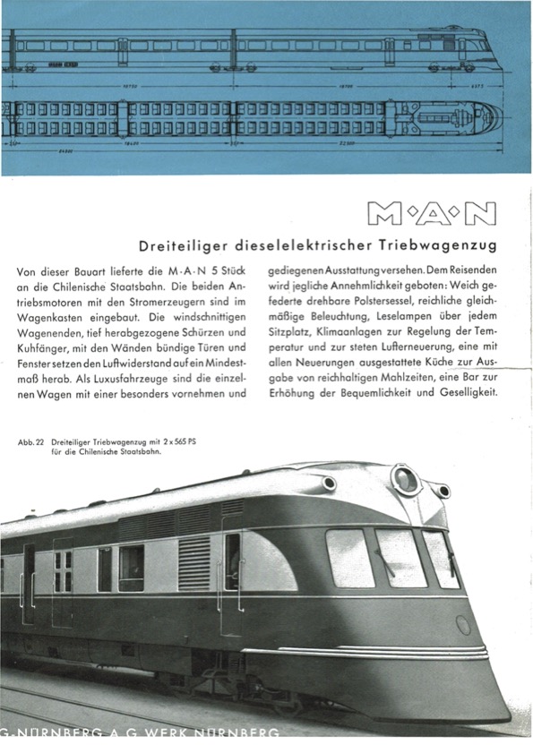 Spannend: der hier gezeigte Triebwagen für Chile wurde im Jahr 1940 in Nürnberg fertiggestellt, dann über das Kriegsende hinaus in der Schweiz zwischengelagert und ca. 1948 in Chile in Betrieb genommen – es war seinerzeit das Modernste, was die Welt zu sehen bekam.