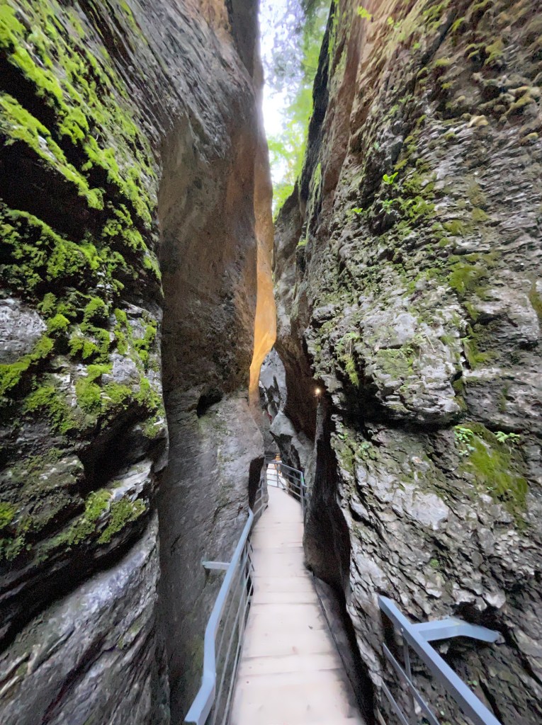 Es geht ja eher harmlos los, mit einem Kassenhäuschen und einem dahinter beginnenden Fußweg. Aber wenn man das kleine Zugangstor hinter einem alten Transformatorenhäuschen durchschritten hat, hält man doch erstmal den Atem an: unter uns gurgelt das Wasser, knapp neben uns sind die steil aufragenden Felswände, und der Himmel ist nur als kleines blaues Stückchen zu erahnen.