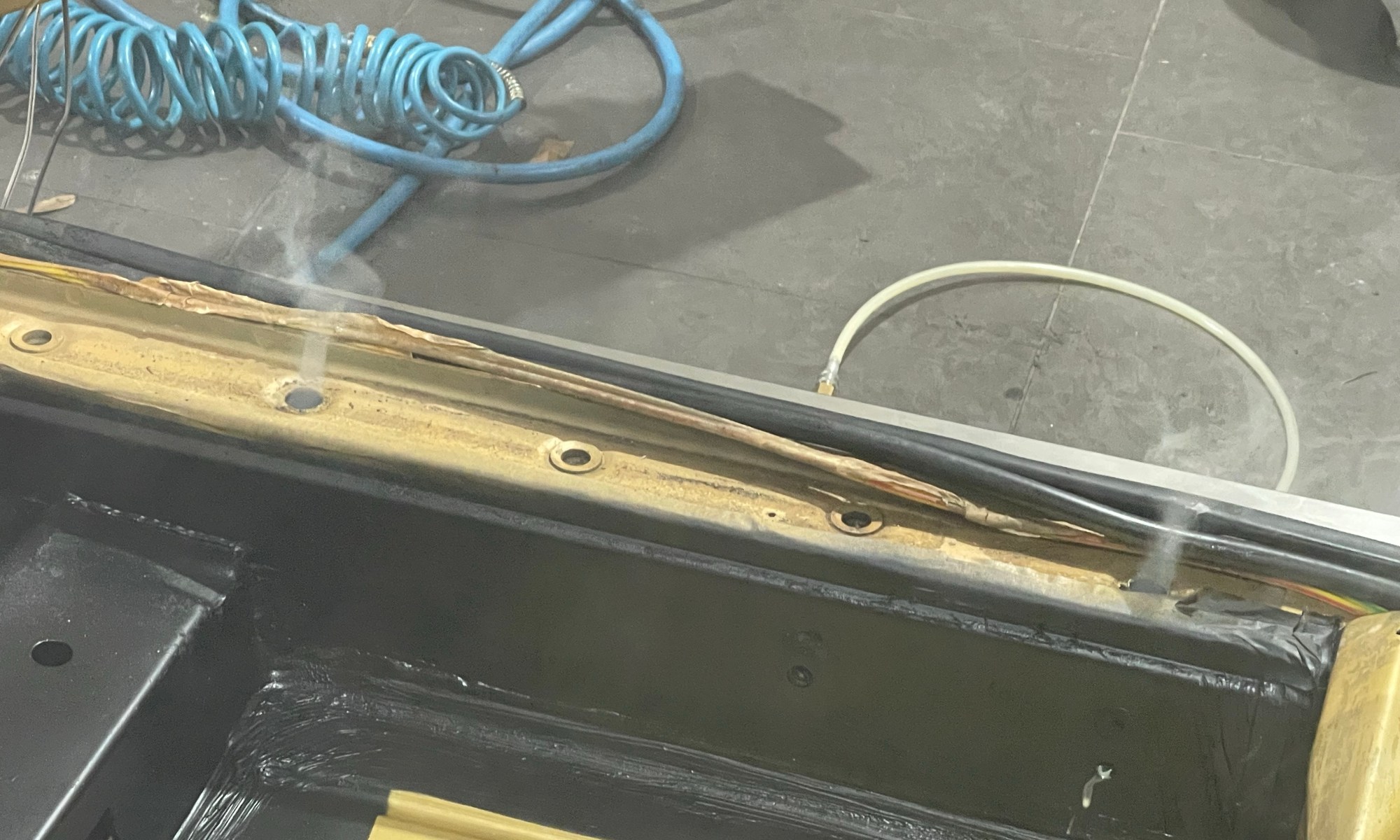 Der Guzzler bekommt nach der Owatrol-Kur nun heute seine Mike-Sander-Ladungen in die Schweller und Hohlräume injiziert – je Seite gute 2 Kilogramm.