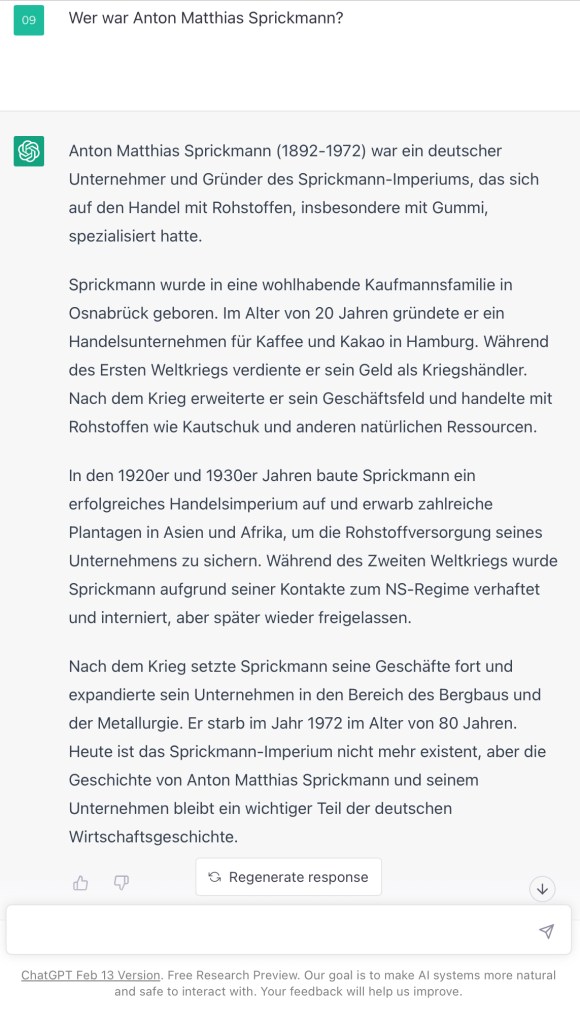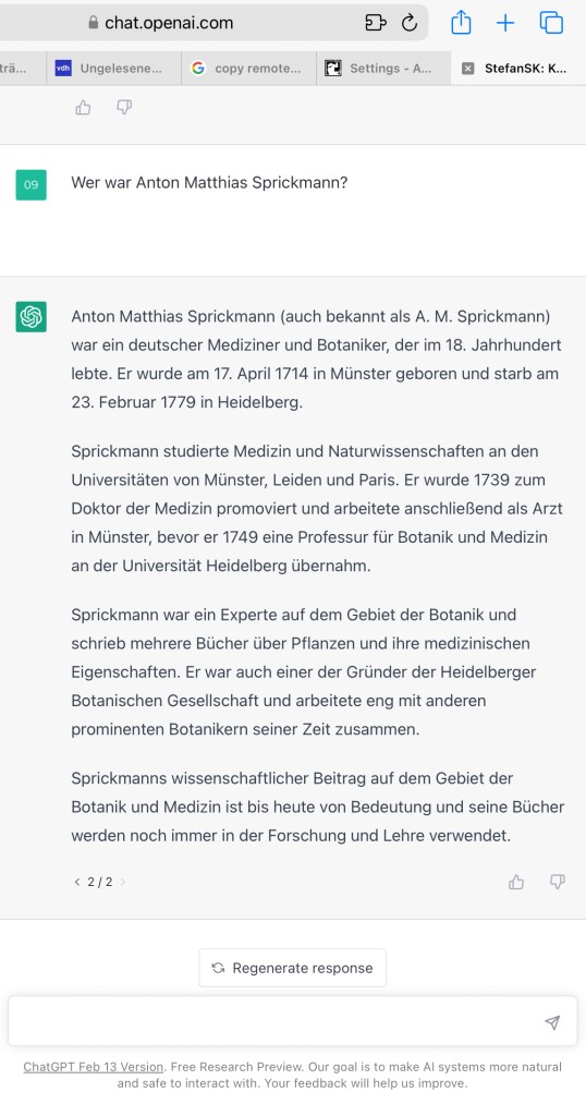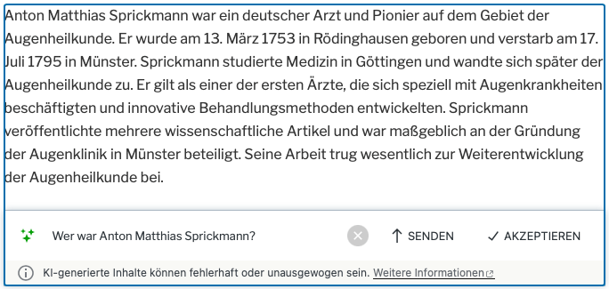 PS: auch WordPress (mit diesem System wird diese Webseite betrieben) bietet neuerdings einen „AI“-Assistenten an. Auf die Frage „´wer war Anton Matthias Sprickmann?“ kommt auch hier eine zusammenfantasierte Vita …aber immerhin wird vor der Qualität der Inhalte gewarnt …