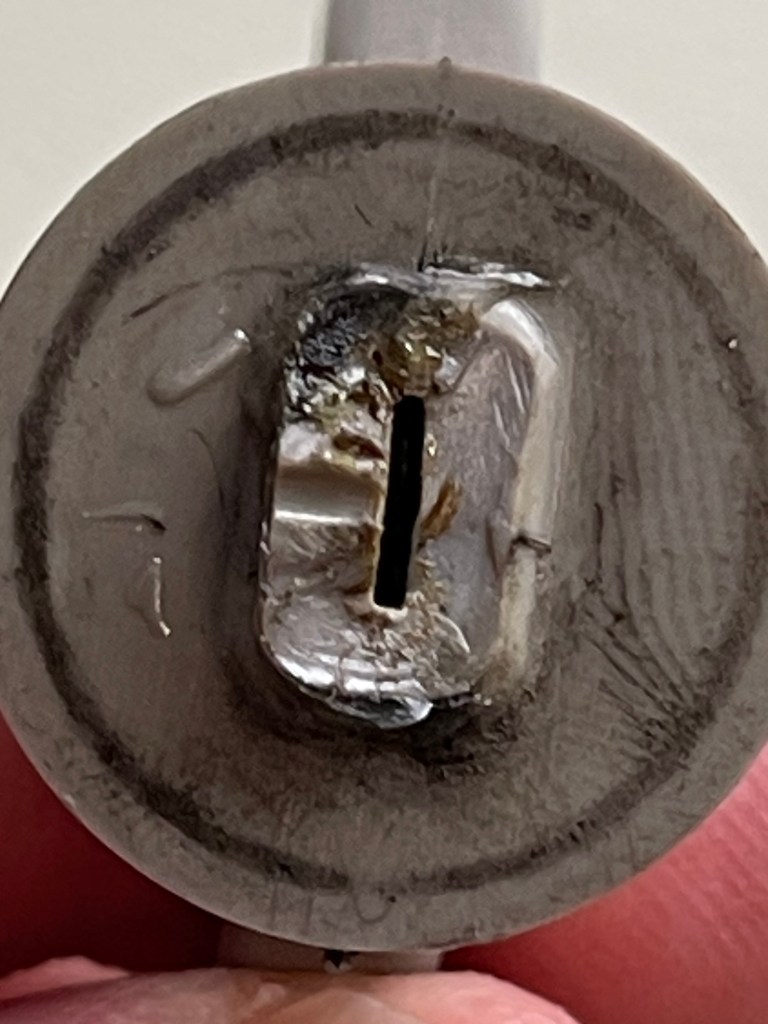 (Ehrlicherweise muss ich bei genauer Betrachtung der Bilder zugeben: ganz in Ordnung war der Griff wohl schon tatsächlich nicht mehr, denn ein dunkel verfärbter Anriss ist zweifellos sichtbar – hatte ich vorher nicht bemerken können.)