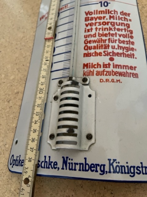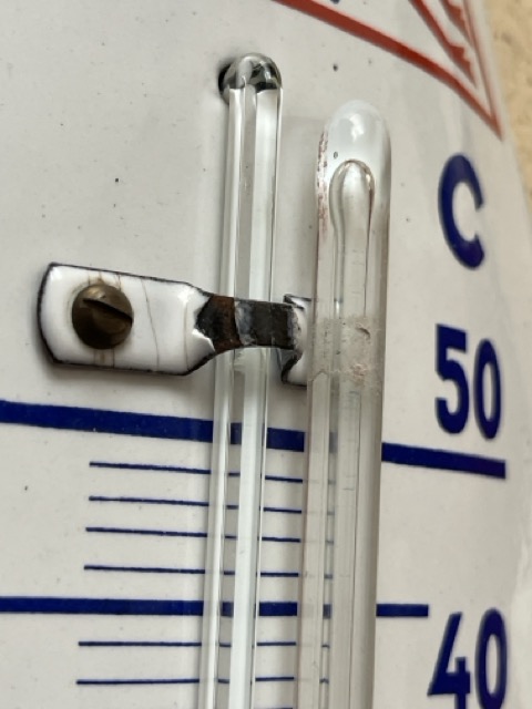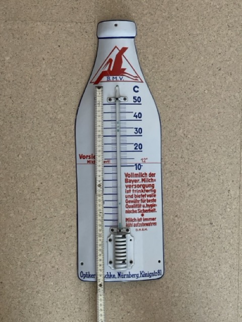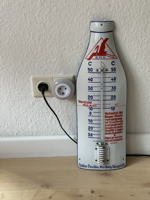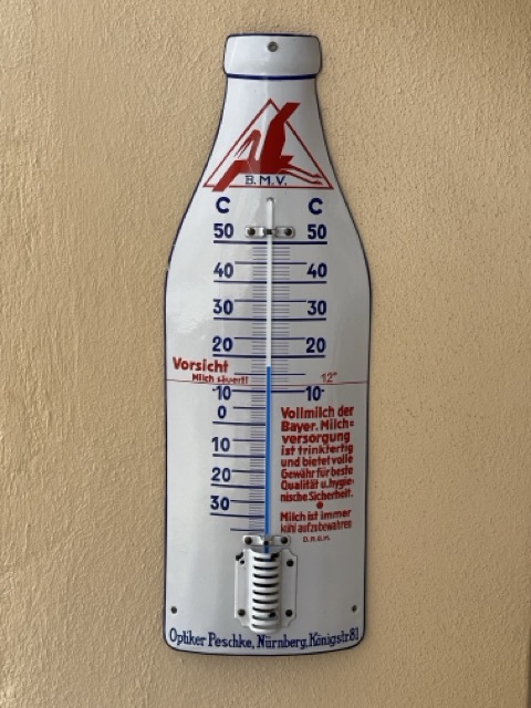 Der Chef liess es sich nicht nehmen, mir nach einem letzten Rundgang ein Souvenir mitzugeben – so kam ich unverhofft in den Besitz eines wunderschönen großen Thermometers aus Emaille, vermutlich aus den 1930ern (so genau wusste er es selber nicht).