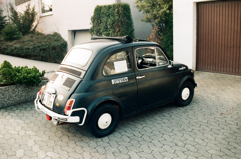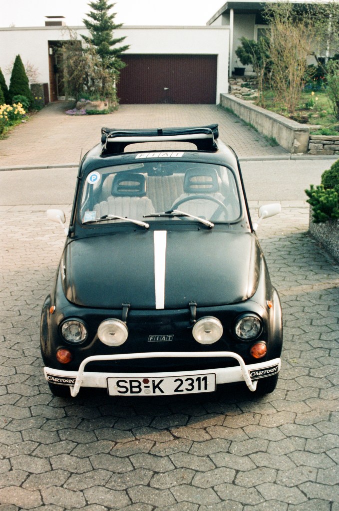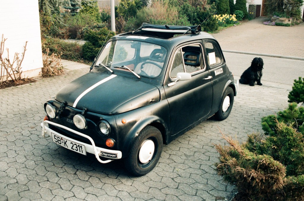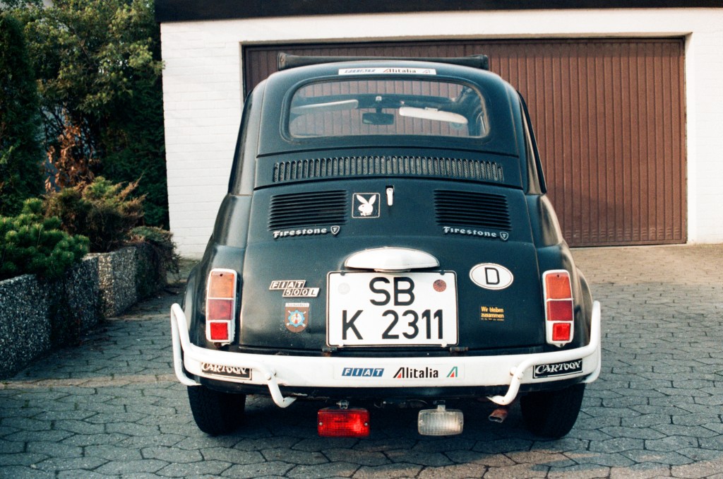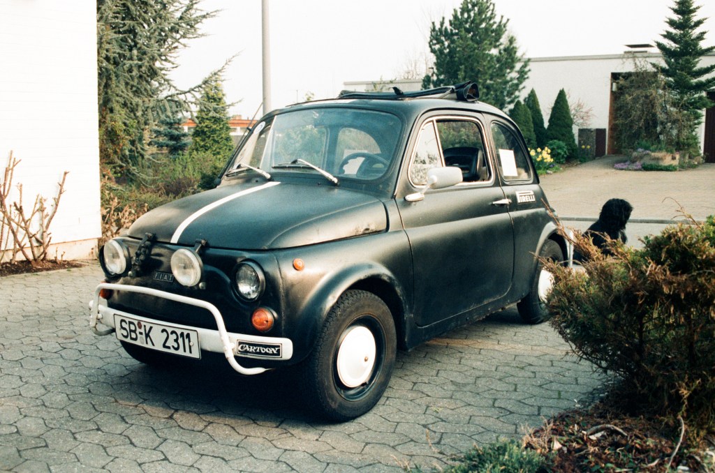 Fiat 500 L, Baujahr 1970. Diesen Wagen übernahm ich im Sommer 1984 für ganze 100 DM von Bekannten meiner Tante aus Frankfurt. Schwarz mit der Rolle lackiert, in lausigem, verbeultem Zustand, fraß dieses Ding mein gesamtes Taschengeld als Oberstufenschüler. Aber gemeinsam mit meinem in dieser Hinsicht bereits vorbelasteten Schulfreund Achim lernte ich aufgrund der allfälligen Reparaturen die Technik rasch ganz gut kennen. Blöd nur, dass die Reparaturen kein Ende nahmen. Daher fiel während meiner Bundeswehrzeit die Entscheidung, vor dem anstehenden Studienbeginn den Fiat gegen ein anderes – zuverlässigeres – Auto auszutauschen. Der Verkauf fiel mir trotzdem schwer, und heute (rund 35 Jahre später) schaue ich jedem Fiat 500 aus den 50er bis 70er Jahren immer noch gerne hinterher. Hätte man damals gewußt, wie die Preise für diese Fahrzeuge mal abheben …