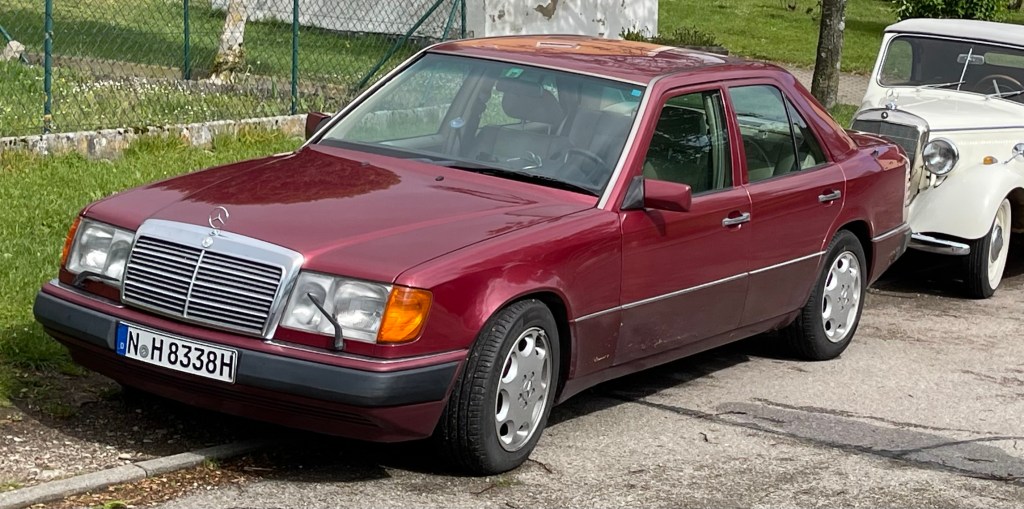 Wieder mal der Zufall … vielleicht sollte ich einfach nicht so oft im Internet herumsurfen. Jedenfalls stolperte ich „zufällig“ über eine Kleinanzeigen-Annonce … ein almandinroter W124 400E stand da zum Verkauf. Ich stellte dem Verkäufer einige Fragen, und – Mist! – es war ziemlich genau die Variante, die mir schon immer am besten gefallen hatte: von außen unauffällig, von innen mit hellem Leder und kräftigem Motor. Schweizer Erstauslieferung, einer der letzten Wagen mit dem „alten Kühlergrill“ und ohne Wasserlack.