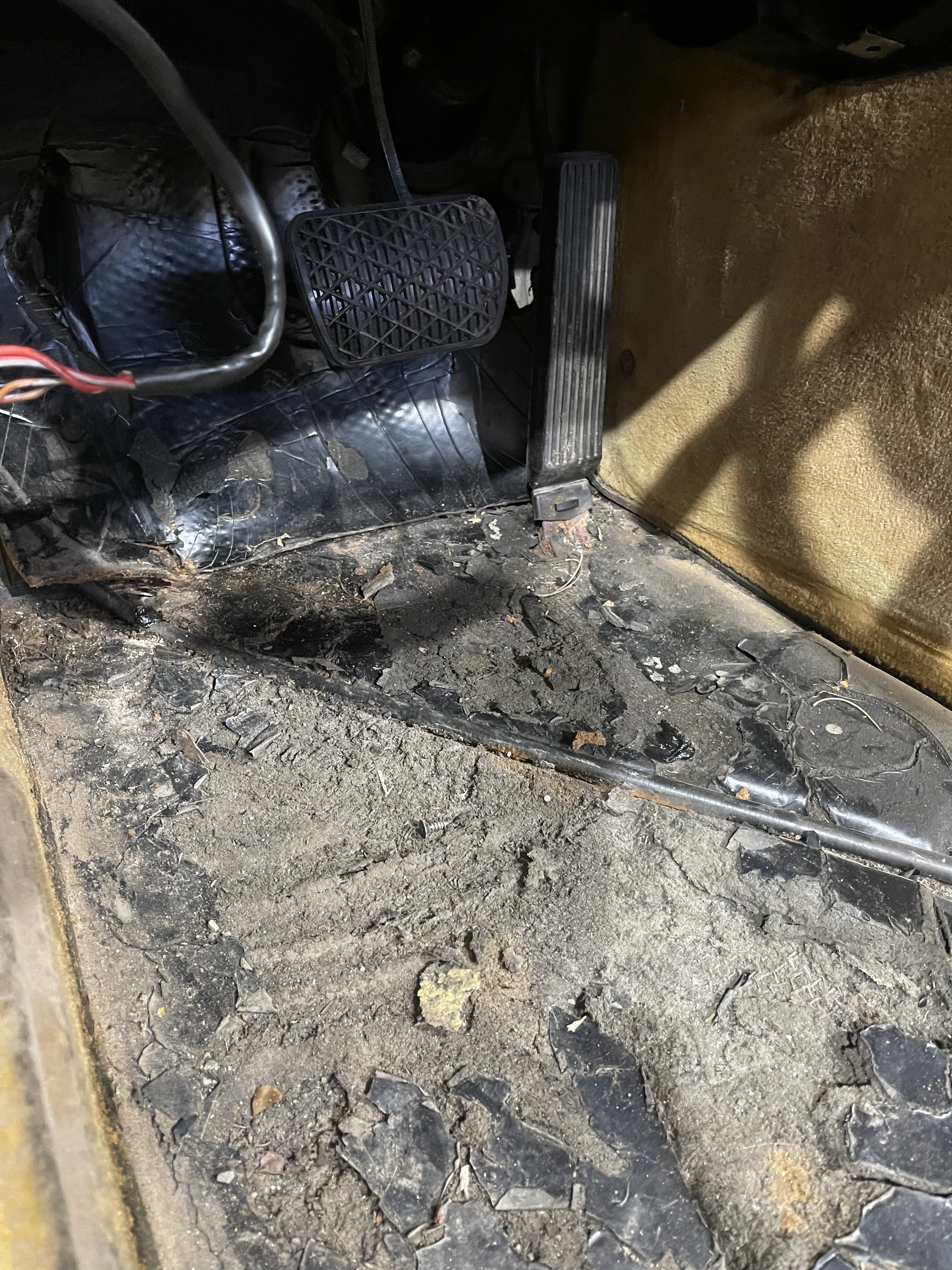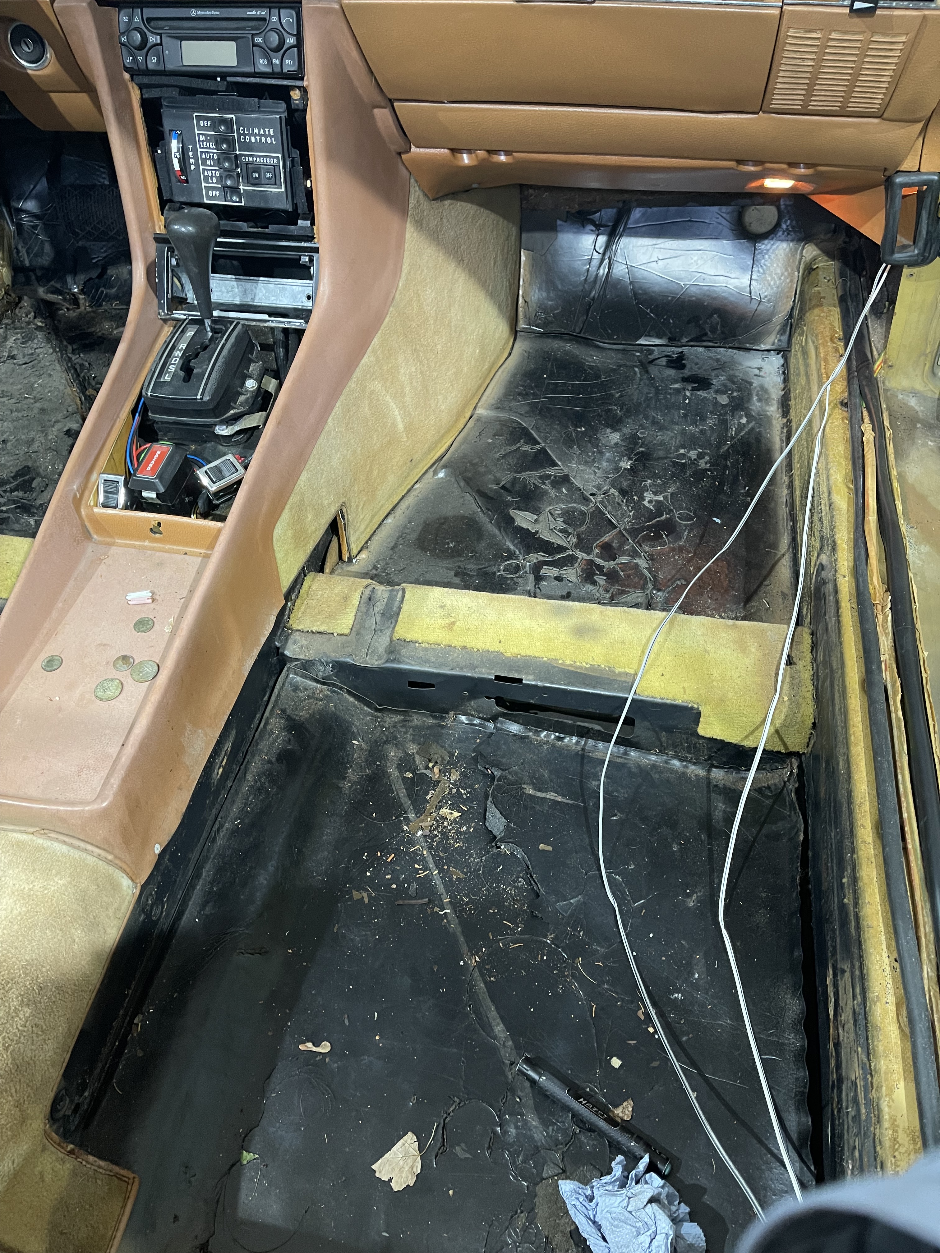Unterm Teppich hat der R107 eine fest verklebte Dämmschicht … und unter dieser Dämmschicht sitzt er gerne – der Gammel. Also reißen wir die Dämmschicht raus und schauen mal nach.