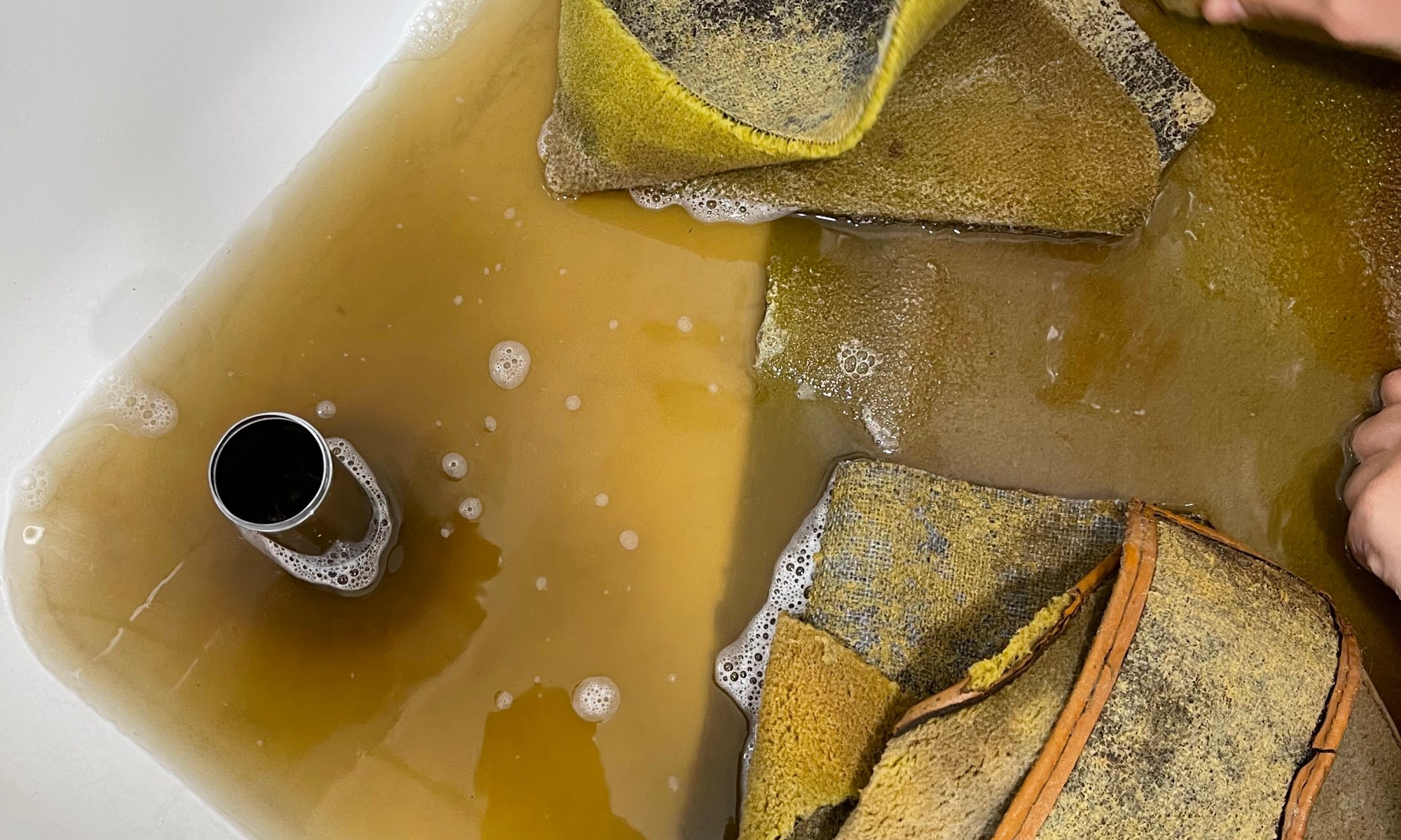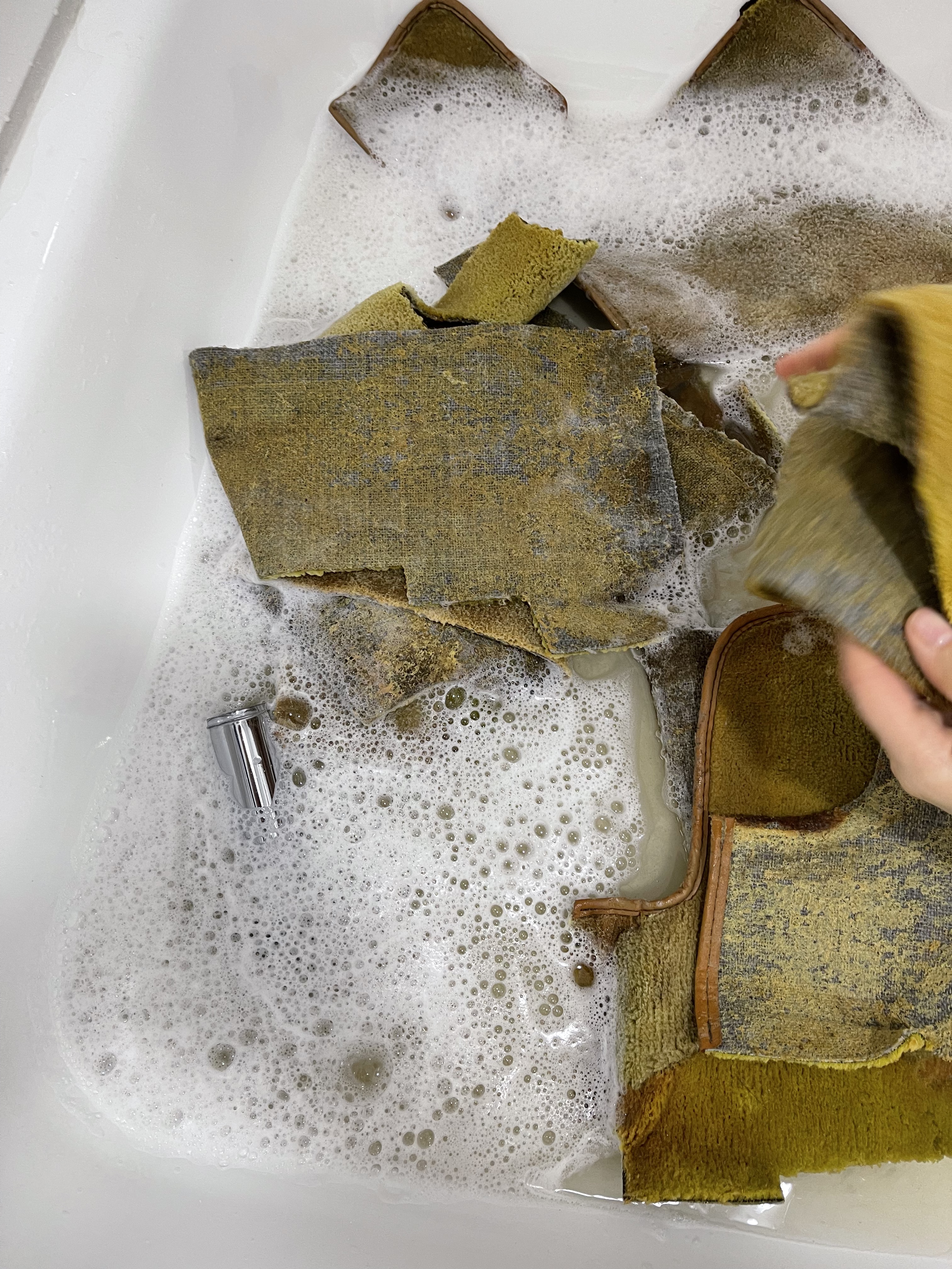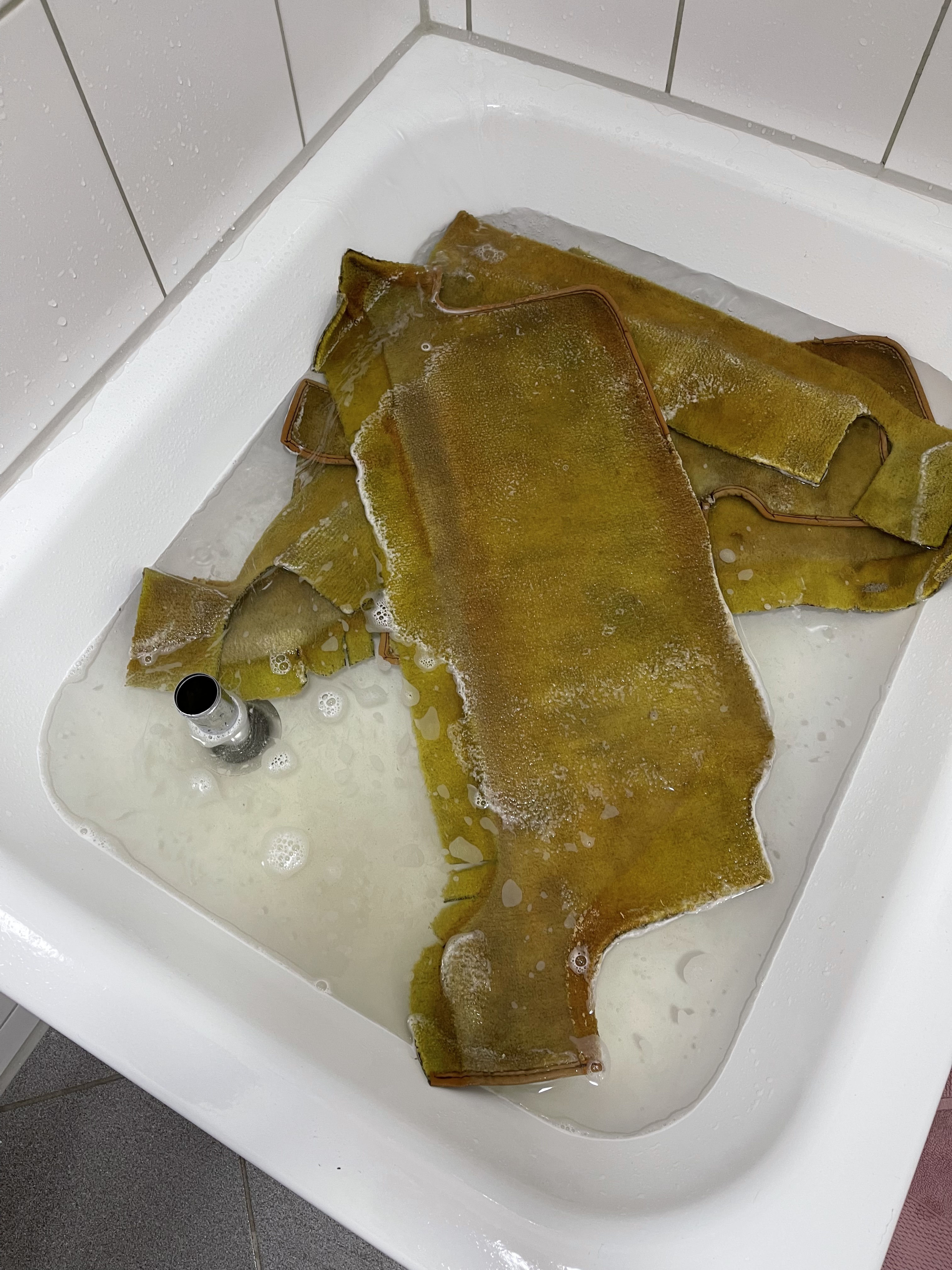 Die ausgebauten (vormals verklebten) Teppiche werden übrigens liebevoll in der Duschtasse mit Feinwaschmittel durchgespült … einmal, zweimal, dreimal, x-mal … bis kein Dreck mehr rauskommt.