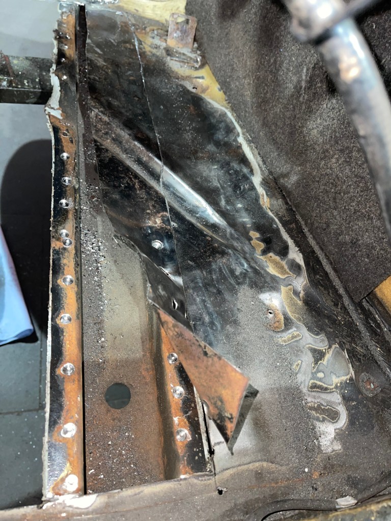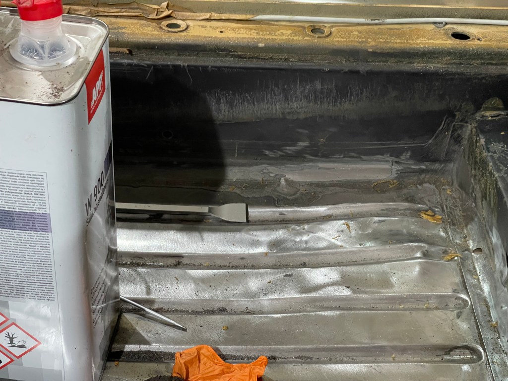 Das Entfernen von Kleberesten geschieht mittels Lösemittel, Lappen und Schaber … sehr mühselig. Anschließend wird der Rost bis aufs blanke Blech abgebürstet. Im Fussraum vorne links sind die Rostlöcher jedoch schon zu tief, so dass hier ein Reparaturblech eingesetzt werden muss.