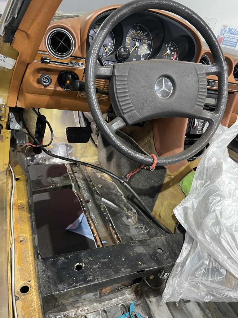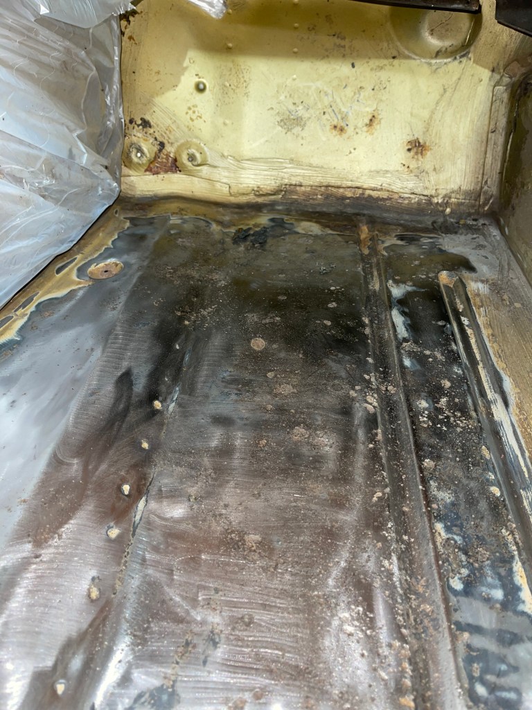 Die Fußräume wurden ja bereits aller Dämmatten etc. beraubt, so dass das mit Kleberesten und Lackierung sowie einigem Gammel patinierte Blech offen zutage trat. Hatte ich bereits erwähnt, dass der Guzzler auf beiden Seiten einen ziemlich lädierten Unterboden aufweist, möglicherweise aufgrund wiederholter Versuche unsachgemäßen Anhebens?