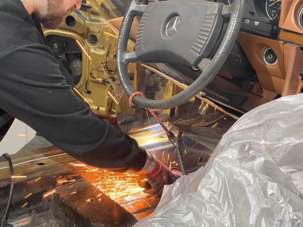 Morgen gehts weiter … dann wird das zugeschnittene Reparaturblech eingesetzt, und ab Montag erfolgt dann der Beschichtungs- und Farbaufbau. Anschließend wird der Wagen wieder komplettiert und die Konservierung vorgenommen.