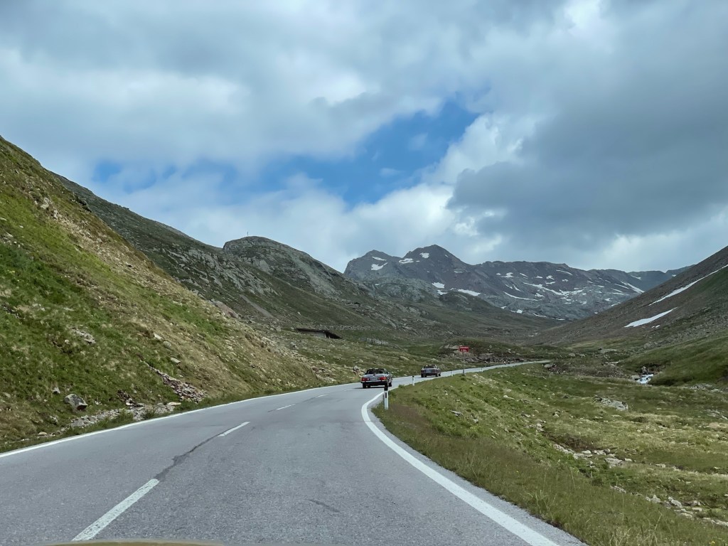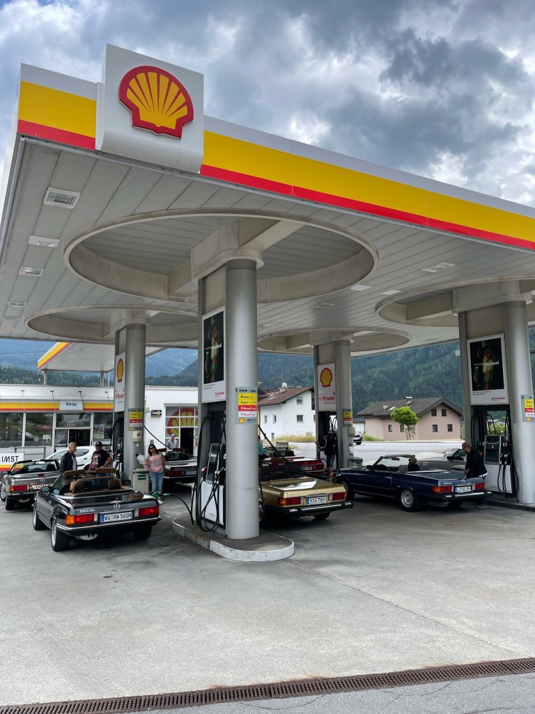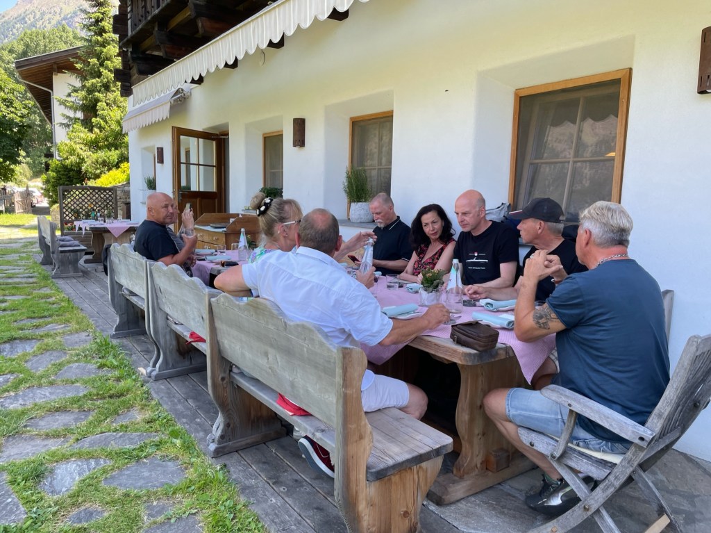 Ein zu ausgiebiges Mittagessen später, und wir starten durch 🇦🇹 Österreich (warum ist da soviel Verkehr?) und zielen auf die Berge. Tankstopp in Imst, dann gehts bergauf. Leider verlieren wir in Ötz einige Tourenteilnehmer, die dann spontan den Reschenpass anstelle des Timmelsjoches befahren.