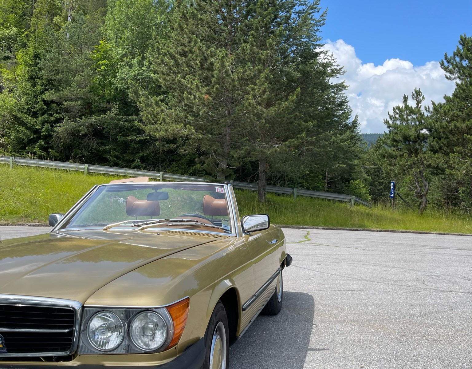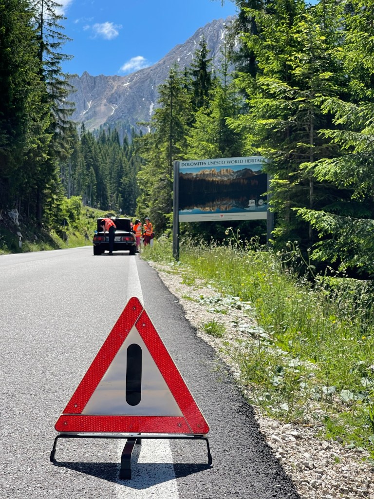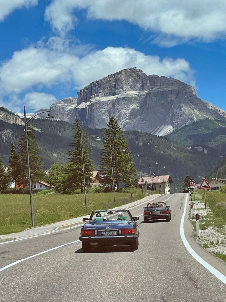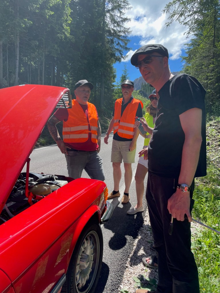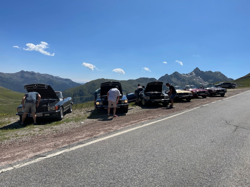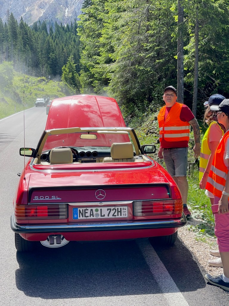24.06.2023 – eigentlich stehen etliche Pässe auf dem Programm, aber es war schon im Vorfeld klar, dass diese Planung zu anspruchsvoll ist. Nach dem Start gegen 09:40 h rollen wir durch Bozen, wo Stephan gleich mal auf einer Kreuzung liegenbleibt – der erste Ausfall. Zu acht geht es weiter auf die SS241, und beim Anstieg entwickelt der 500 SL von Hannes, der vor mir rollt, dermassen große Ölwolken, dass ich ihm einen Stopp signalisiere. Es zeigt sich: die Ventildeckeldichtung ist massiv undicht, es tropft Öl bis auf die Straße, an eine Weiterfahrt ist nicht zu denken. Der ADAC-Notruf arbeitet recht umständlich, aber nach einer Stunde können wir Linda und Hannes beruhigt einen guten Kilometer vor dem Karersee zurücklassen, wo sie bald eingesammelt werden sollten.
