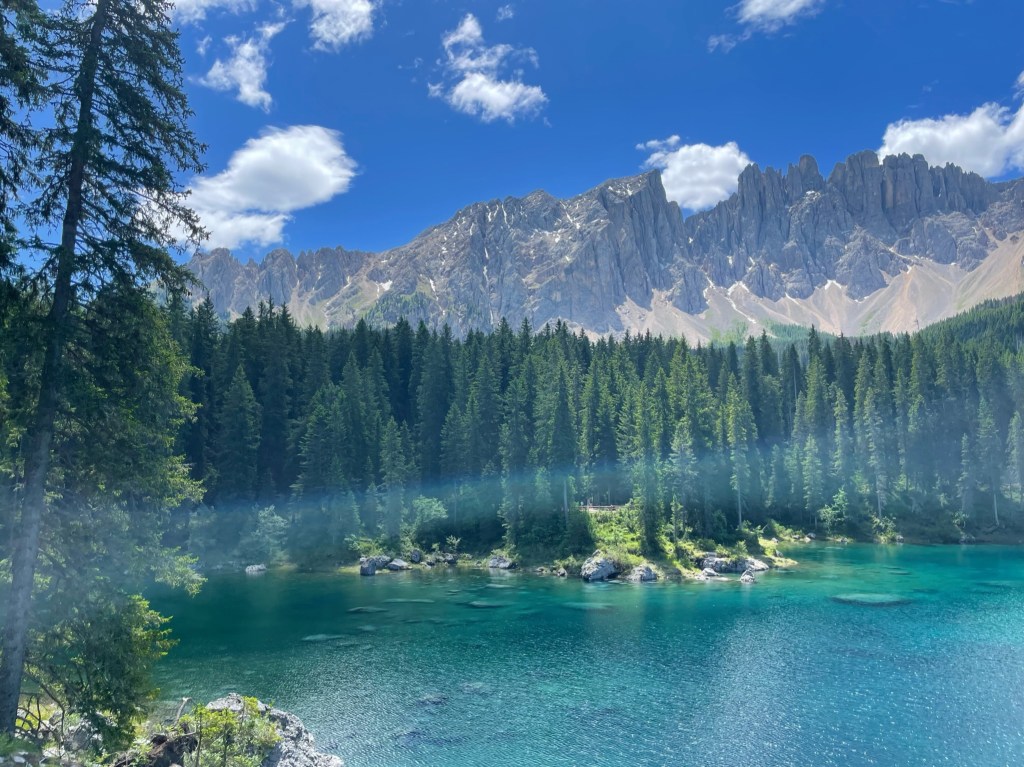 Am Karersee ein kurzer Stopp vor grandioser Kulisse, dann gehts zu siebt weiter nach Canazei, wo wir in einer kleinen Station mit tollem Ausblick unser Mittagessen einnehmen.