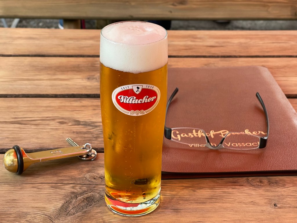 Der „Bacherwirt“ in Villach war uns bisher nur durch seinen Biergarten bekannt, den wir vor einigen Jahren als Mittagsrast auf dem damaligen Weg nach Slowenien gefunden hatten – diesesmal testen wir die Hotelqualitäten, das Zimmer ist jedenfalls recht ansprechend und die Leute sind ausnehmend freundlich. Im Biergarten gibt’s ein Abendessen und – klar: ein Bier.