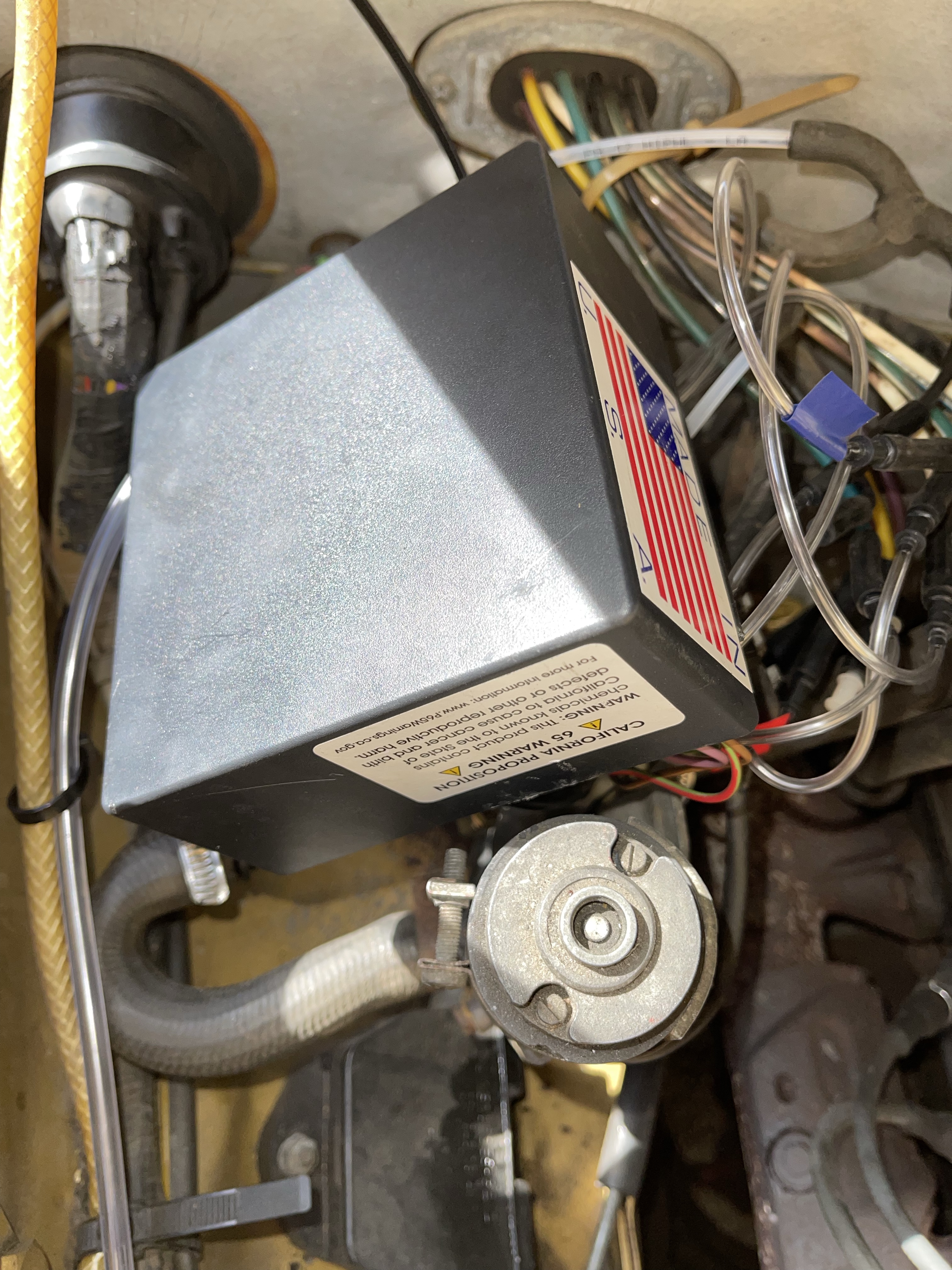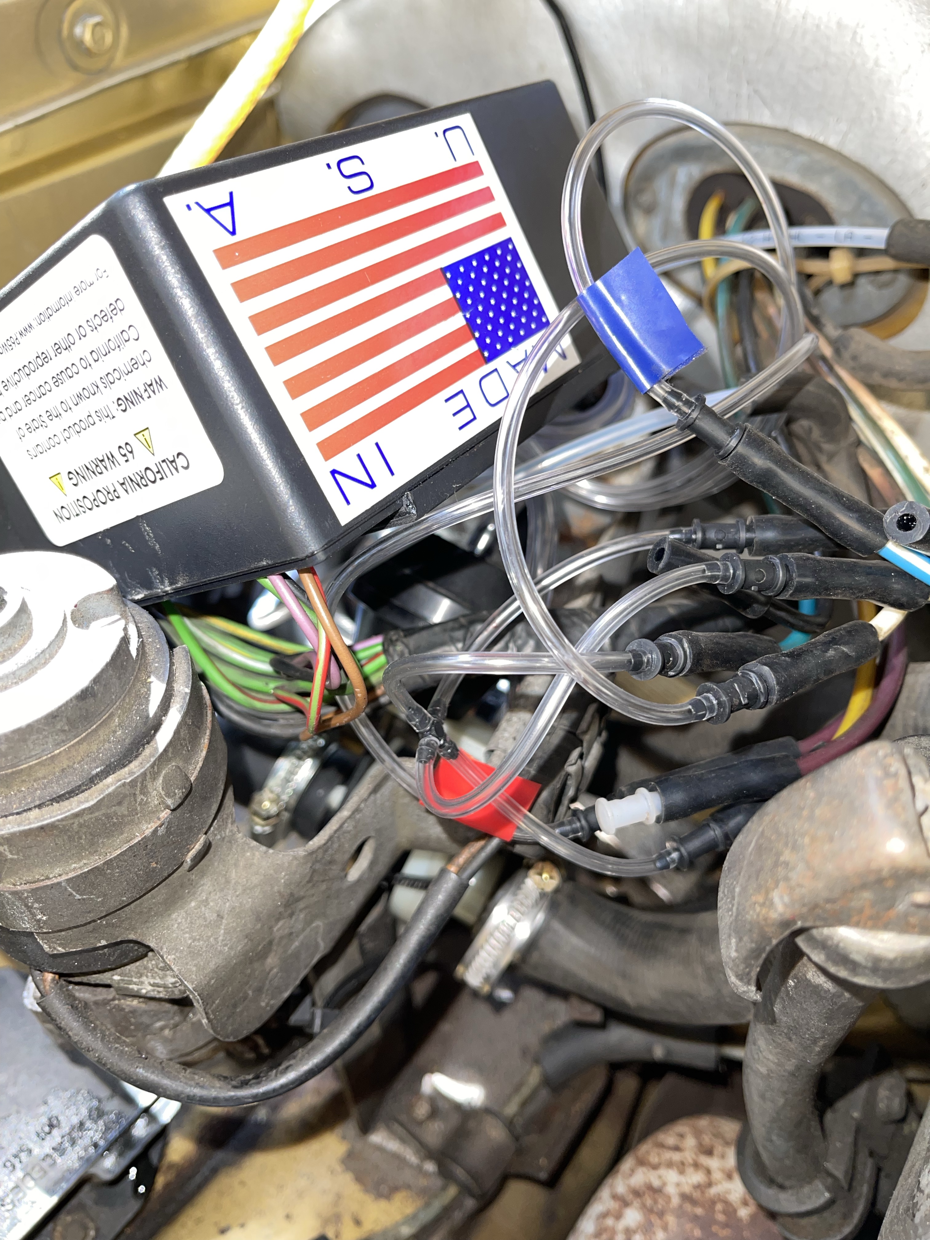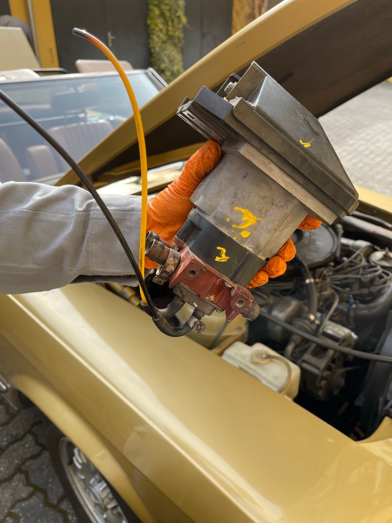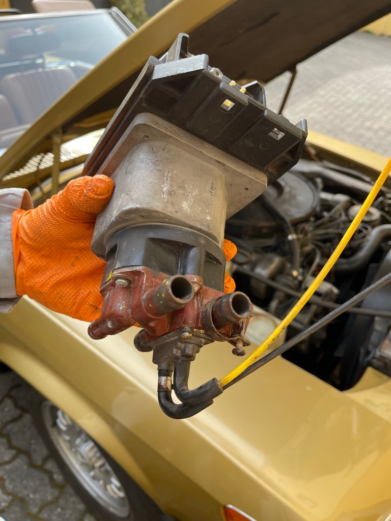 Tja, da wird’s jetzt schwierig … zumindest beim R107. Die Hamilton-Anleitung meint lapidar „feel free to use cable ties“ (sinngemäß: „mit Kabelbindern befestigen“), aber das ist aufgrund der beengten Platzverhältnisse im R107 nicht so einfach. Meine erste Idee, die Box seitlich hochkant stehend am übriggebliebenen Haltebügel des herausgenommenen Regulierventiles zu befestigten, ließ sich nicht umsetzen – die Haube ist zu flach. Daher habe ich eine Kombination aus einem Lochstreifenblech sowie zwei Kabelbindern gewählt und damit die Box „windschief“ in den zur Verfügung stehenden Bauraum eingesetzt, aber das ist sicher nur ein Provisorium und gefällt mir nicht. Erschwerend kommt hinzu, dass ich nicht an den dauerhaft sicheren Sitz der elektrischen Steckverbindungen glaube und auch die Stabilität der von Hamilton verwendeten Klarsichtschläuche gegen hohe Umgebungstemperaturen sowie Unterdruck bezweifle.