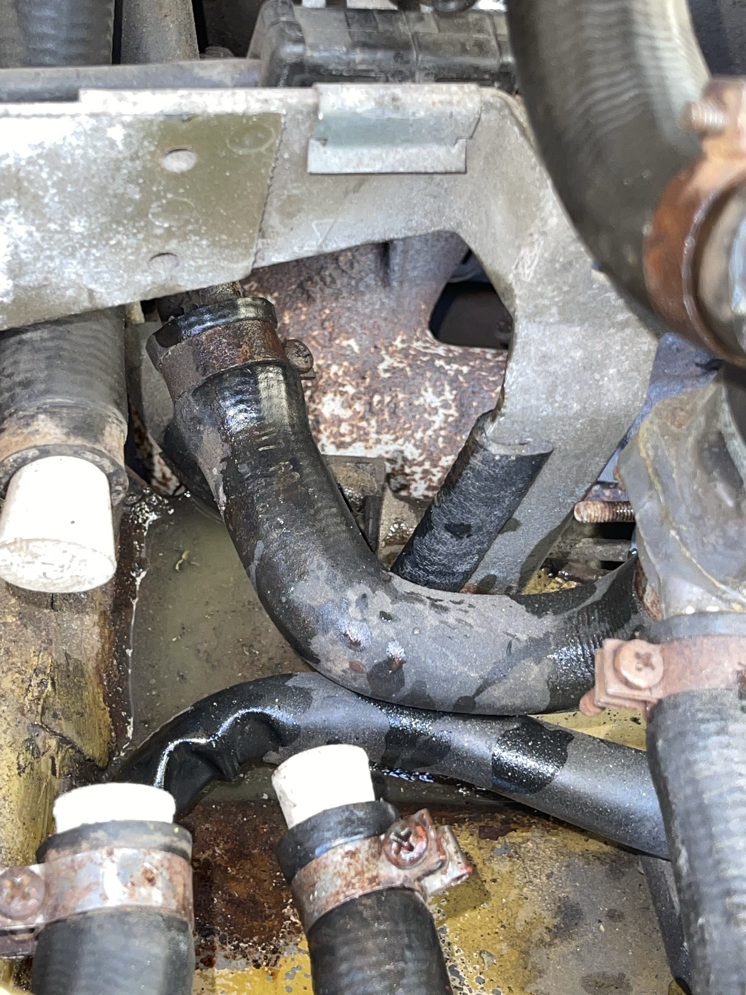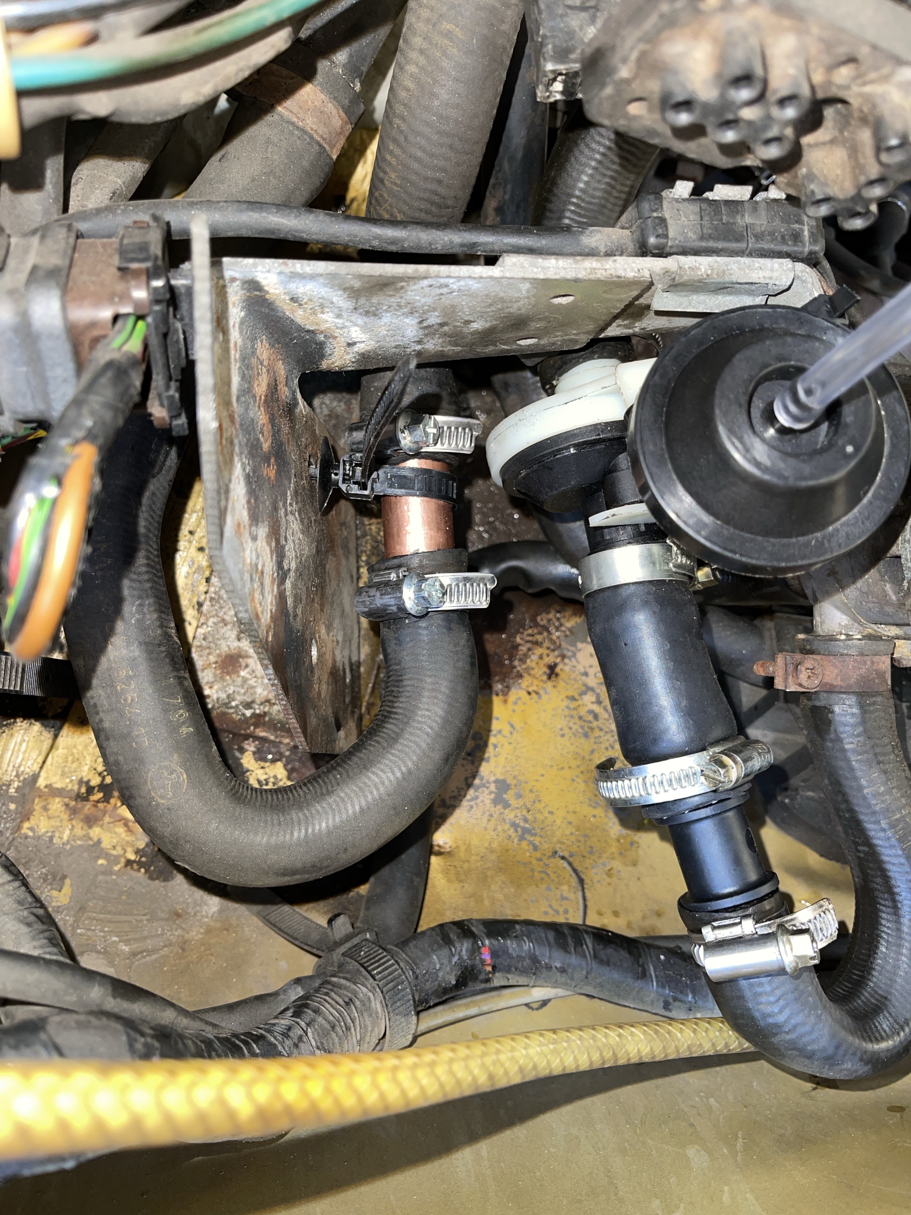 Allerdings lässt sich dieser Fehler rasch beheben: diese „Sollbelüftungsstelle“ besteht tatsächlich aus einer aufgerollten Kupferlitze, die mittels Gummimuffe in die Unterdruckleitung eingesteckt ist. Sieht ziemlich schräg aus, gehört aber so. Und weil das wohl ein paar Meter Kupferkabel sind, kann man ganz einfach die zur Undichtigkeit führenden vordersten zehn Zentimeter abschneiden und das System „neu stecken“ … aber daswar wohl noch nicht alles.