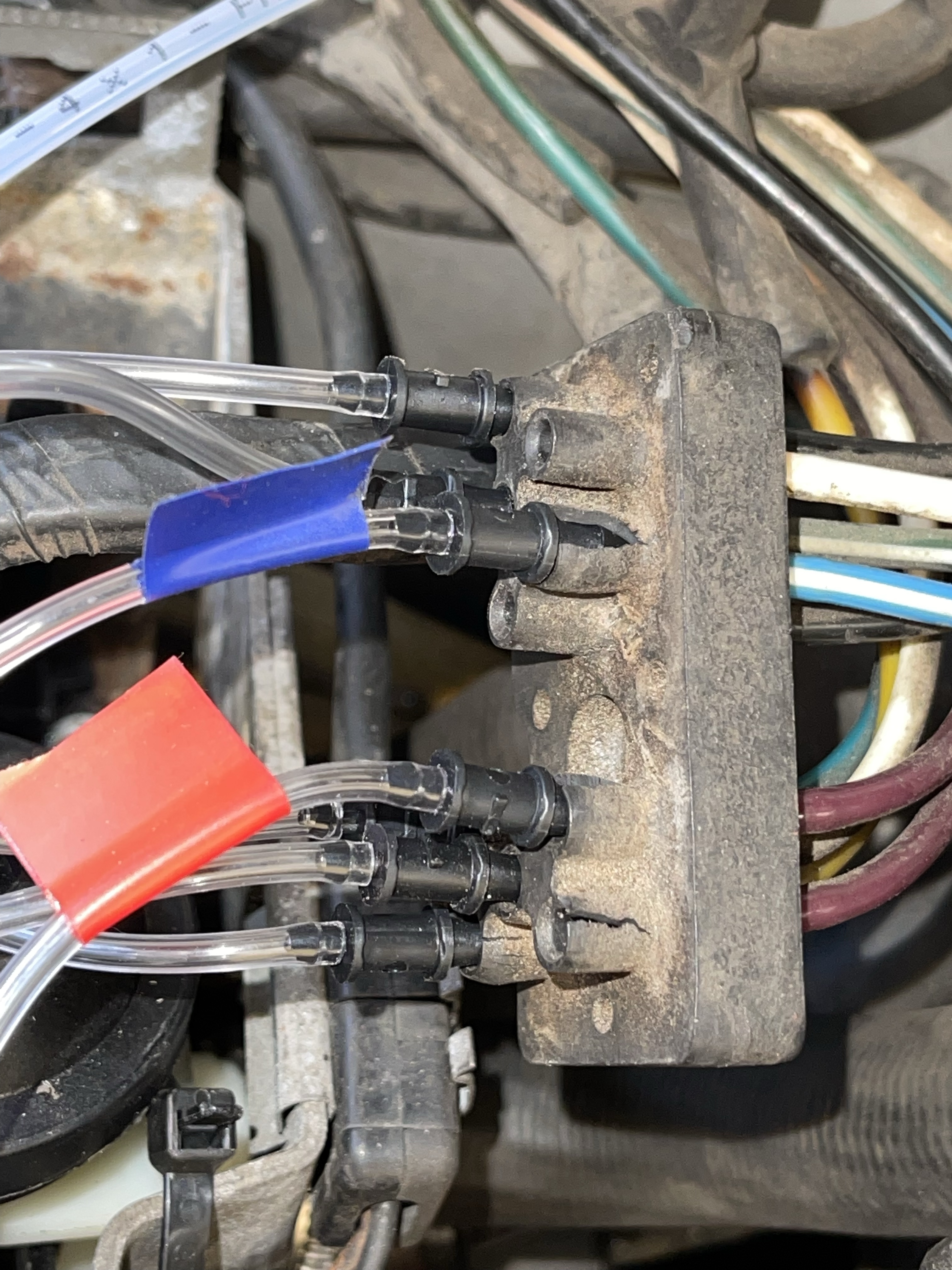Daher habe ich kurzerhand an einigermaßen gut zugänglicher Stelle (hinter dem Handschuhfach) die entsprechende Leitung getrennt und abgestopft, so dass zwar die (undichten) Klappen links funktionslos bleiben, die rechtsseitigen jedoch angesteuert werden können. Nach dieser Operation wird der Druckschalter auch zuverlässig angesteuert, der Klimakompressor läuft in allen Stellungen … aber es bleibt immer noch warm, viel zu warm im Auto.