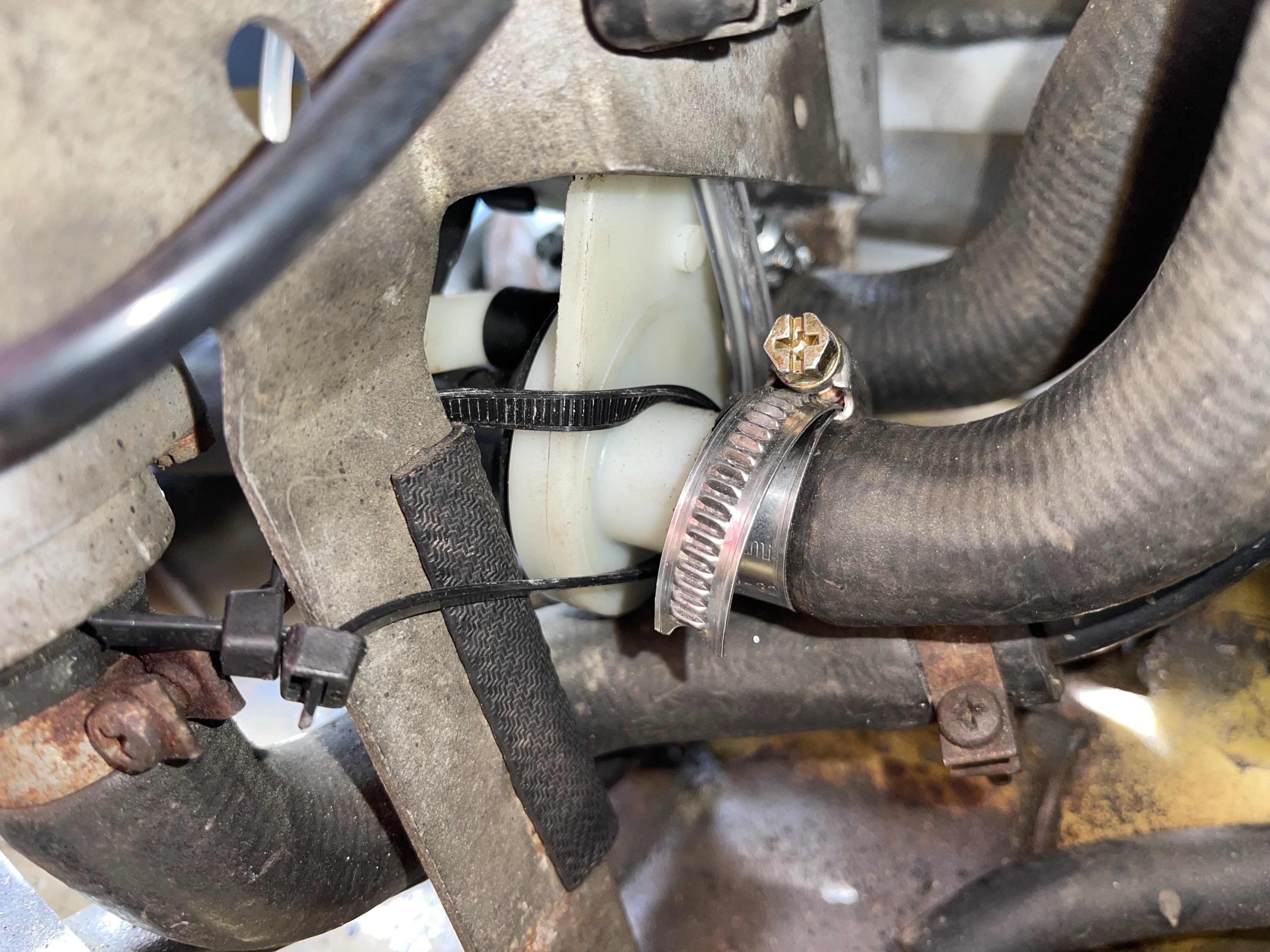 Übrigens: das beim Hamilton-Kit mitgelieferte Schlauchstück ist nach einem Jahr Einsatz dermaßen verhärtet, dass es sich nicht mehr demontieren lässt und aufgeschnitten werden muss – das bestätigt meinen gewonnenen Eindruck „gute Idee, mäßige Umsetzung“. - nach den Arbeiten werden Kühlerdeckel und Kühlsystem nach dem Auffüllen kalt abgedrückt, hierbei bemerke ich noch eine Undichtigkeit am oberen Kühleranschlussstutzen. Komisch, das war bei der Prüfung beim Berlacher „neulich“ nicht entdeckt worden. Nachzug der Schlauchschelle hilft vorerst.