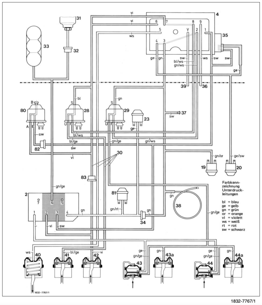 Hier hat Hamilton in seiner Anleitung eine sehr schöne Darstellung gewählt, die an und für sich auch gut umsetzbar ist … wenn nicht – wie bei meinem Fahrzeug festgestellt – die Gummianschlußstückchen in der Steckverbindung allesamt total porös und brüchig sind. Daher blieb mir dann nichts anderes übrig, als alle benötigten Unterdruckleitungen abzutrennen und mittels Silikonschlauch neu auf die entsprechenden Hamilton-Anschlüsse aufzustecken.