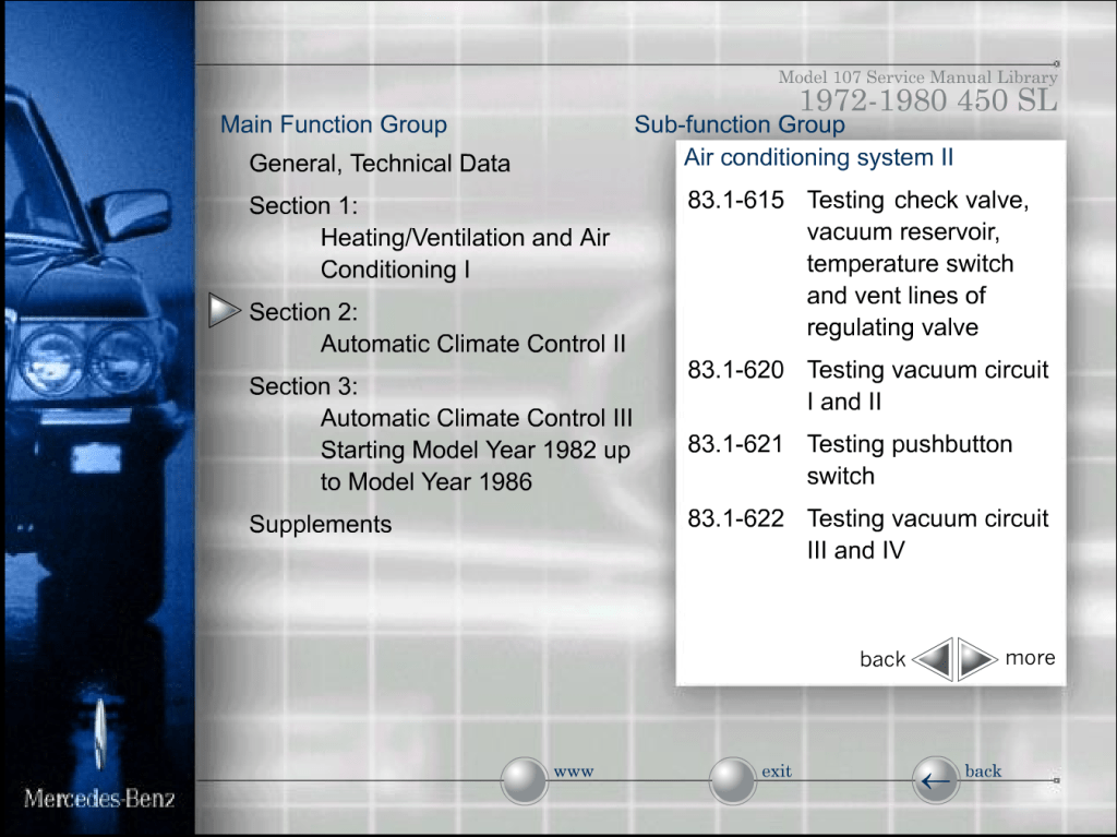 Glücklicherweise bietet die DVD zum R107 eine detaillierte Prüfanweisung für die einzelnen Vakuumkreise (Kapitel 83.1-620 und folgende), und ich konnte bald feststellen, dass Kreis III mängelfrei ist; in Kreis IV konnte ich eine Undichtigkeit im Bereich der Doppelelemente links diagnostizieren.