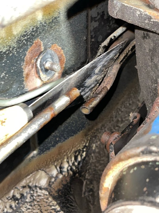 Doch noch eine positive Meldung – letzthin haben wir die durchgegammelte Spritleitung auftrennen und mit einem eingesetzten Stück Kraftstoffschlauch reparieren können; nun müssen nur eben noch alle für die Schweißarbeiten gelockerten und gelösten Leitungen am Unterboden auch erstmal wieder korrekt befestigt werden.
