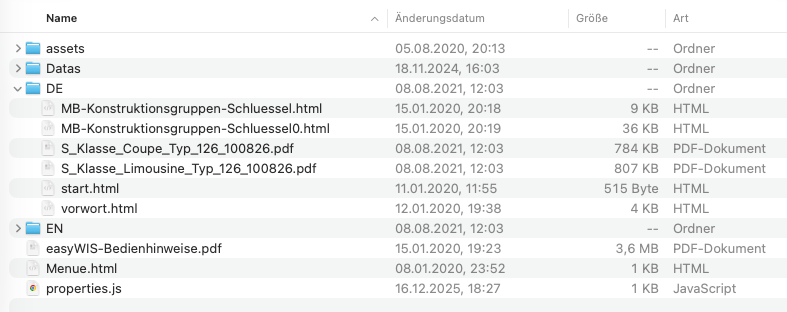 „easyWIS“ besteht aus einer Anzahl HTML- und JS-Dateien sowie einigen PDF- und Grafikfiles und macht nichts anderes, als das Datenverzeichnis der Original-DVD („Datas“) mit einem Inhaltsverzeichnis, einer Suchfunktion und einer Navigationsmöglichkeit zu ergänzen.